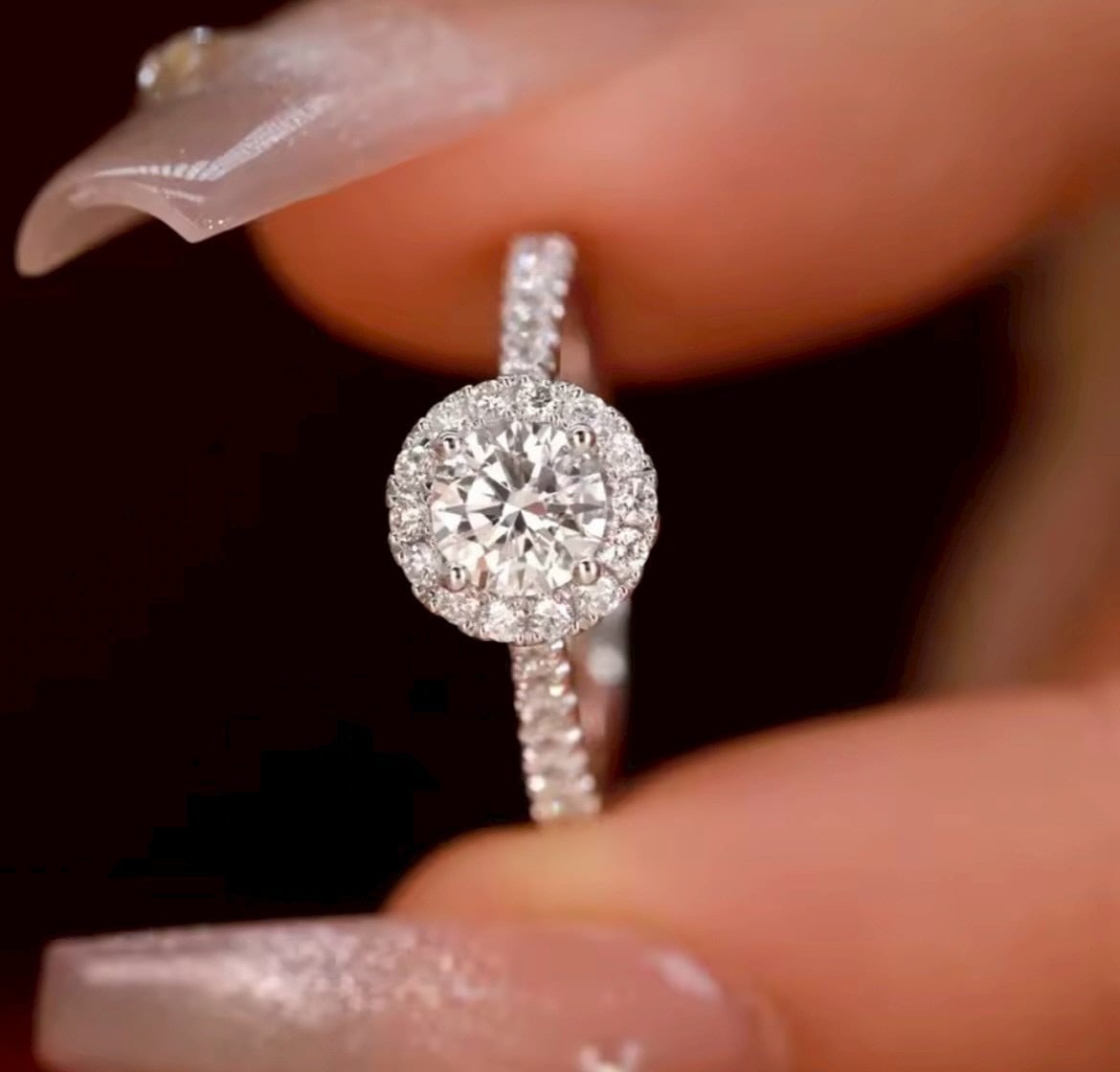 中央で輝く0.5カラットのモアサナイトを、小粒のストーンがぐるりと取り巻くハローデザイン。
