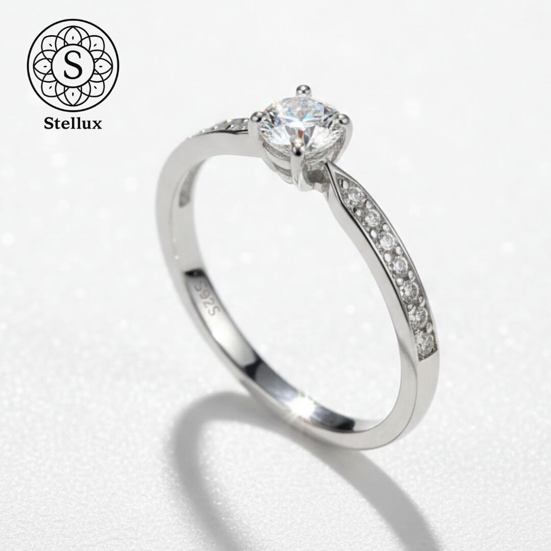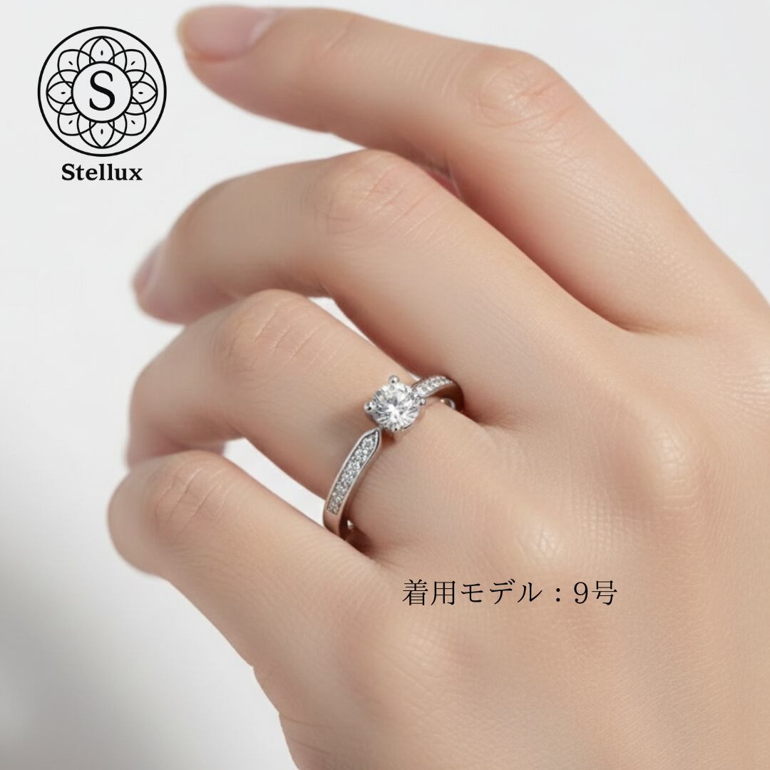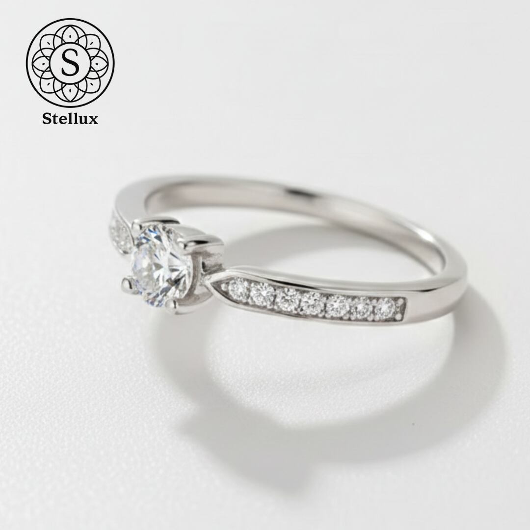 0.3ctのセンターストーンを、繊細なマイクロパヴェのアームが引き立てる、Stellarux(ステラックス)のシグネチャーモデルです。