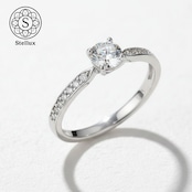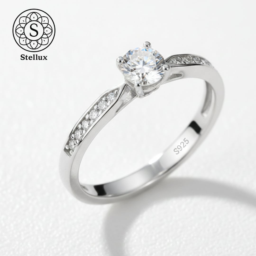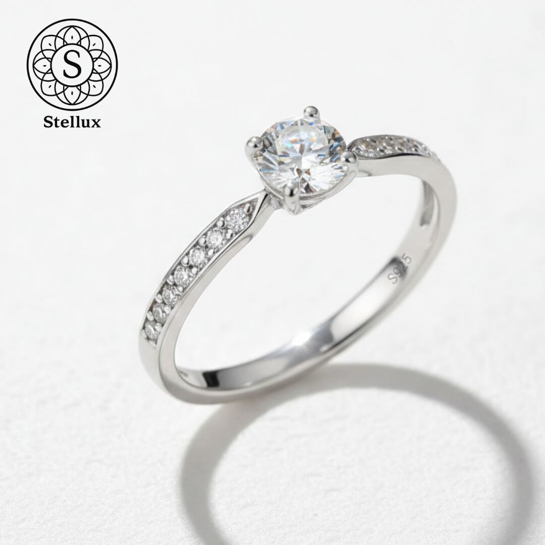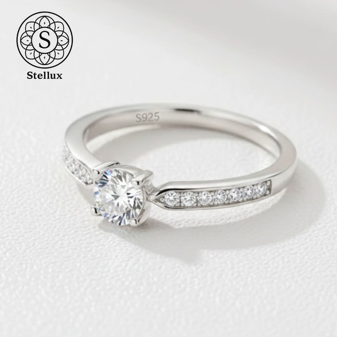 0.3ctのセンターストーンを、繊細なマイクロパヴェのアームが引き立てる、Stellarux(ステラックス)のシグネチャーモデルです。