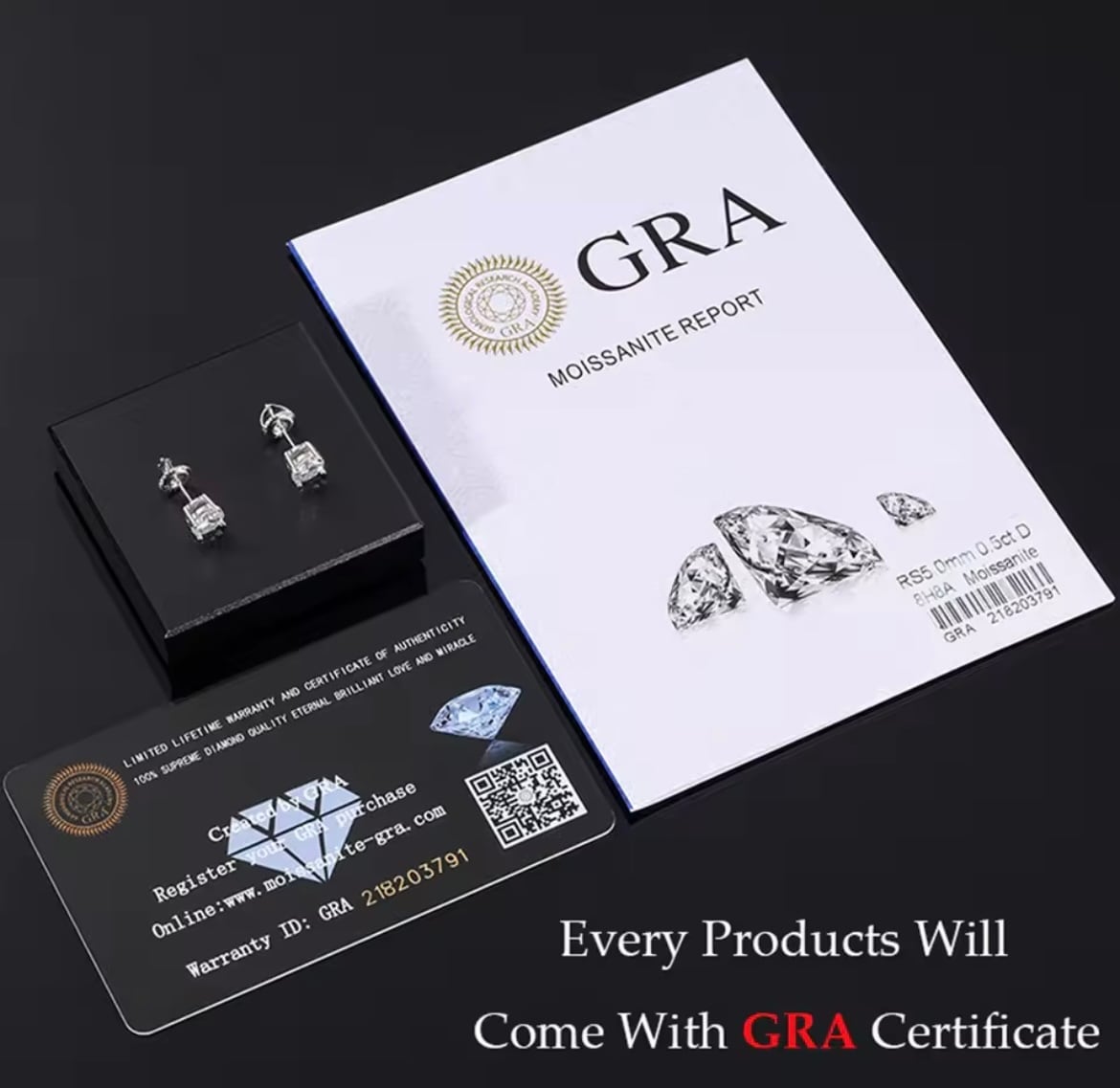 Wの書類で不安ゼロ:モアサナイトのGRA鑑定書+地金のS925貴金属検査保証書を同梱。見た目だけでなく証明書でも本物を証明できます。